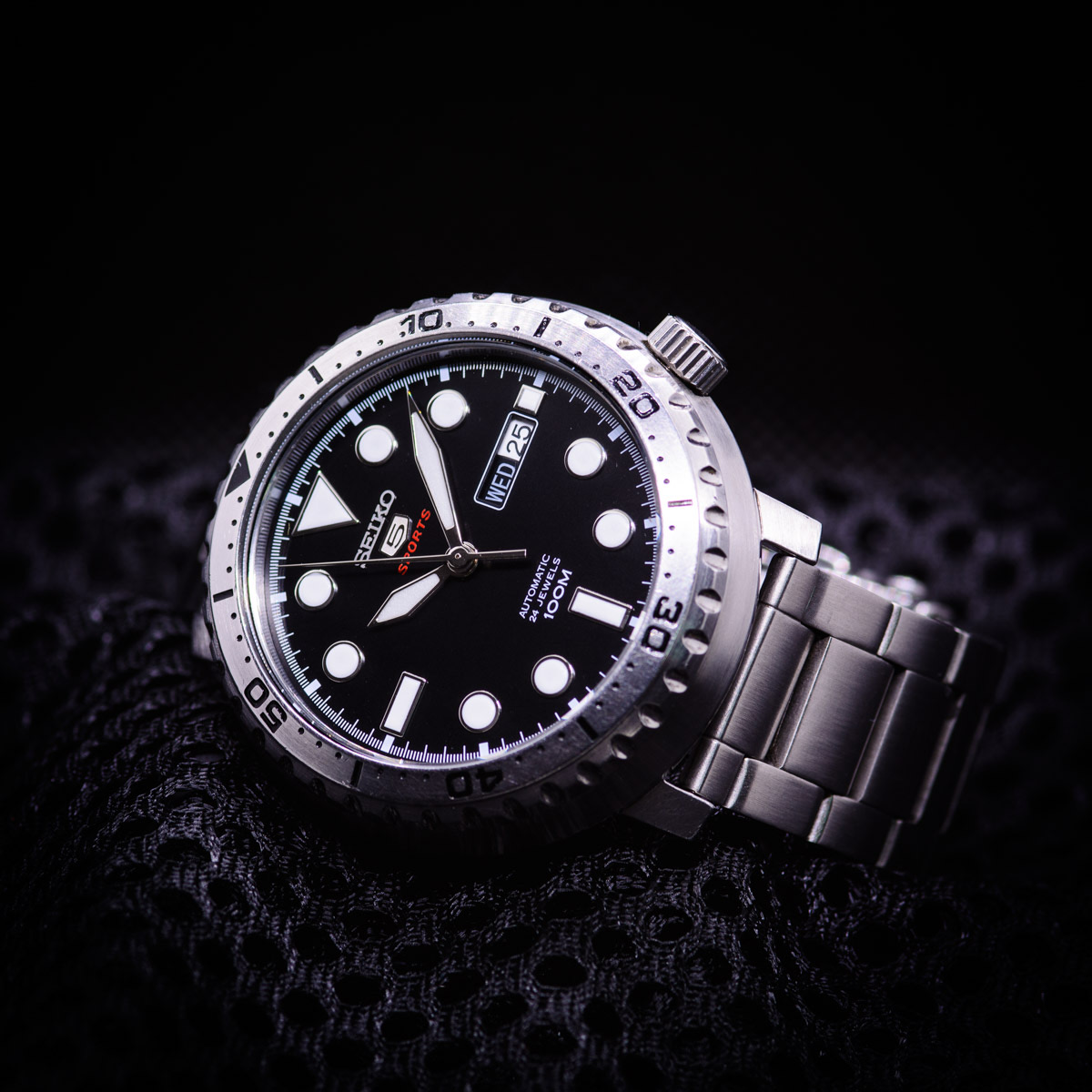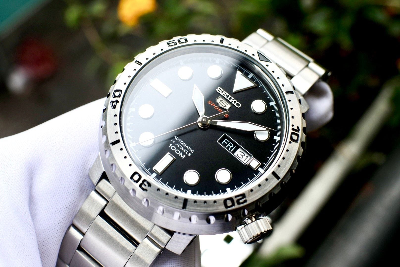 قاب استیل ضد زنگ با بند استیل ضد زنگ. قاب استیل ضد زنگ با قابلیت چرخش یک جهته. صفحه مشکی با عقربههای نقرهای درخشان و نشانگرهای ساعت نقطهای. نشانگرهای دقیقه در اطراف لبه بیرونی. نوع صفحه: آنالوگ. عقربهها و نشانگرهای شبتاب. نمایش روز هفته و تاریخ در موقعیت ساعت ۳. موتور اتوماتیک کالیبر سیکو ۴R۳۶، حاوی ۲۴ جواهر، با سرعت ۲۱۶۰۰ ضربه در ساعت و ذخیره انرژی تقریباً ۴۱ ساعت.
