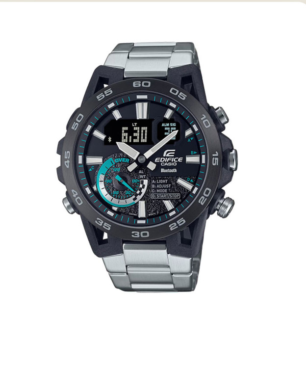 کنترل سرعت و هوش را با ترکیب آنالوگ-دیجیتال EDIFICE با الهام از سیستم تعلیق اتومبیل مسابقه و انرژی خورشیدی، در دست بگیرید. SOSPENSIONE ECB-40، اولین EDIFICE با بدنه رزین تقویت شده با فیبر کربن است و به لطف طراحی منحصر به فرد بدنه که بند ها را در یک پیکربندی چهار بازو و قابل تنظیم قرار می دهد، روح واقعی موتوراسپرت را هم به طراحی و هم به مواد این ساعت می بخشد. همگامسازی با تلفن هوشمندتان از طریق برنامه و بلوتوث و انتقال داده ها به گوشی بسیار سریع است. چراغ LED مشاهده صفحه آنالوگ-دیجیتال را برای شما بدون مشکل می کند، و سیستم Tough شما را شارژ نگه می دارد و حتی با مقدار کمی نور میتوانید عملکردی فوق العاده داشته باشید.